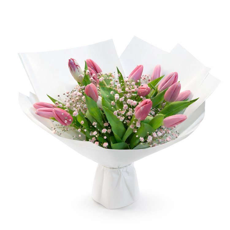 Περιλαμβάνει: Ανθοδέσμη με 17 τουλίπες & Ροζ Γυψοφίλη
